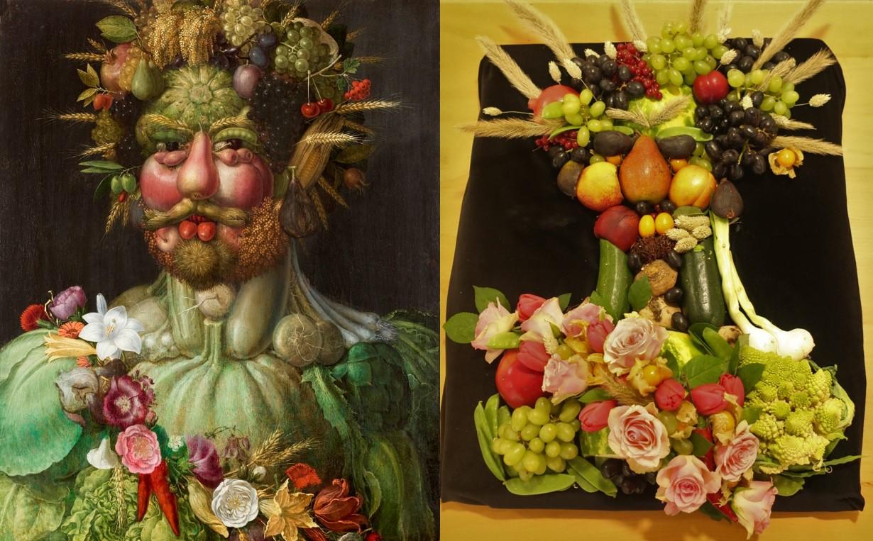 Bilden visar till höger ett stilleben byggt av konststuderande vid Åbo Akademi, inspirerat av målningen till vänster, Giuseppe Arcimboldos målning Vertumnus, Rudolf II, målad på 1590-talet.